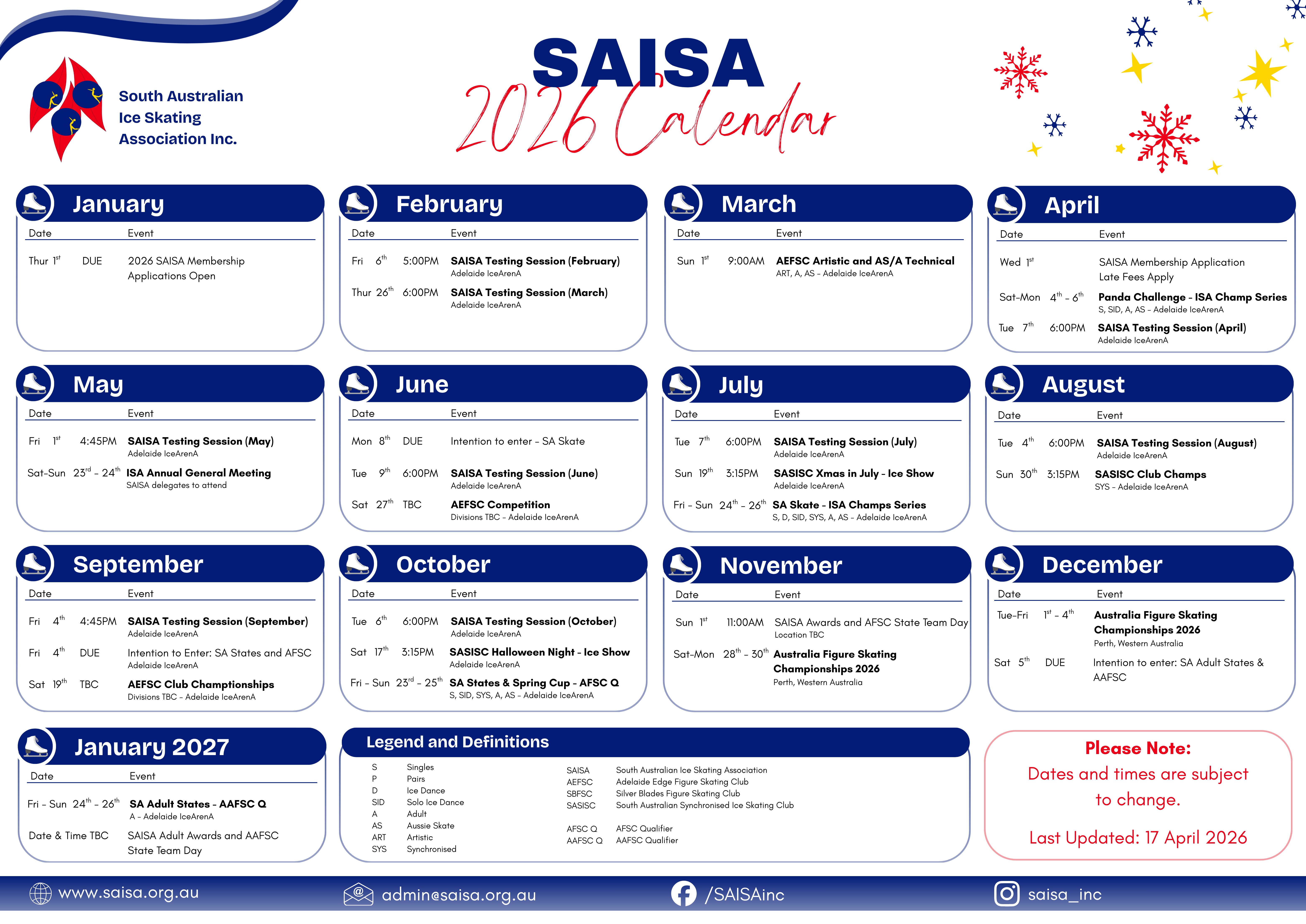 SAISA Competition and Championship Guidelines contain information for skaters, parents and coaches.